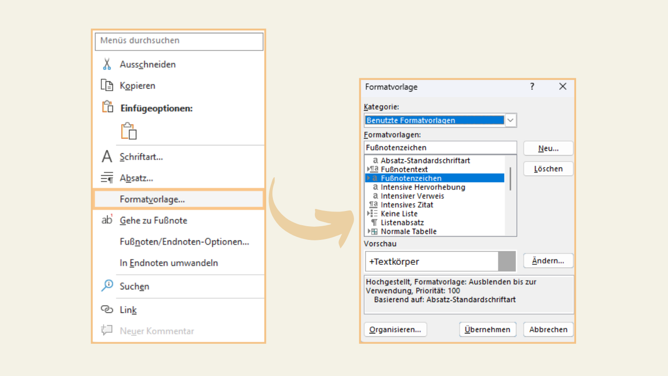 - Schritt 3: Auf "Formatvorlage ..." klicken. Wenn oben die Kategorie "Benutzte Formatvorlagen" aktiviert ist, wird die Formatvorlage "Fußnotenzeichen" sofort angezeigt.